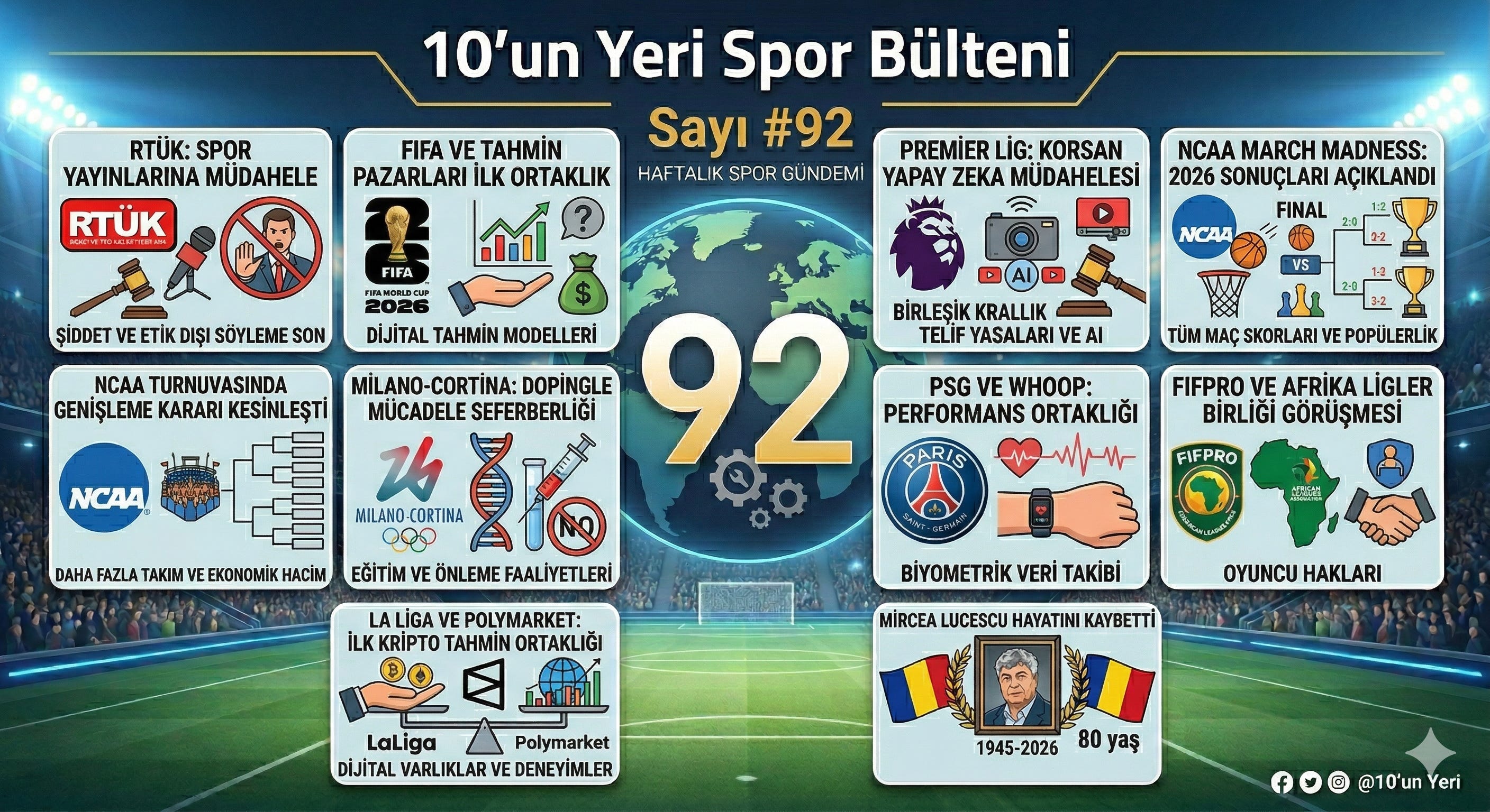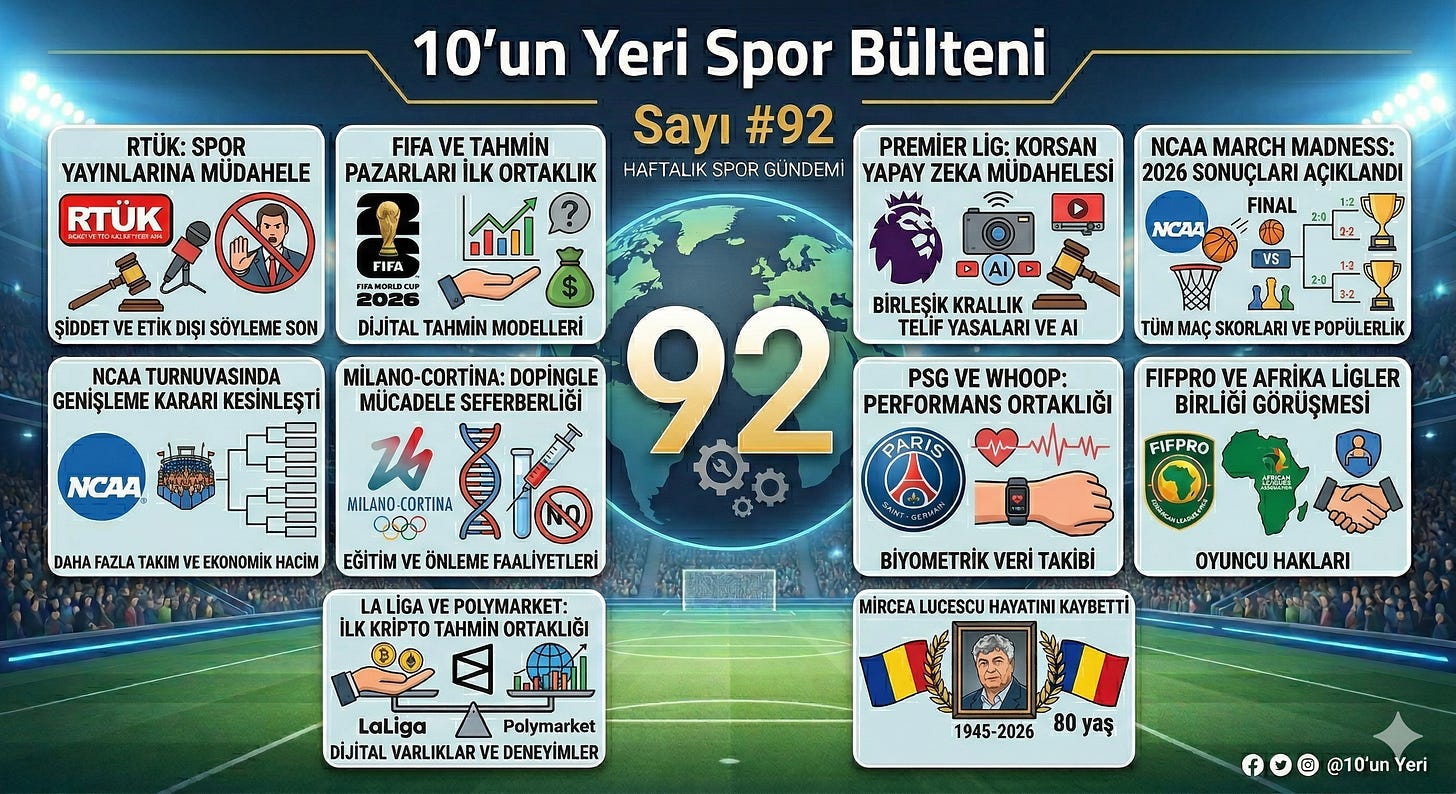 Bültenimizin bu sayısında, RTÜK’ün Türkiye’de spor yayıncılığına yönelik getirdiği yeni etik ilke kararlarını, Premier Lig’in korsan yayınla mücadelede yapay zekâ teknolojilerini devreye almasını, Milano-Cortina 2026 Kış Olimpiyatları öncesinde hız kazanan dopingle mücadele eğitimlerini ve NCAA’deki gelişmeleri ele aldık.